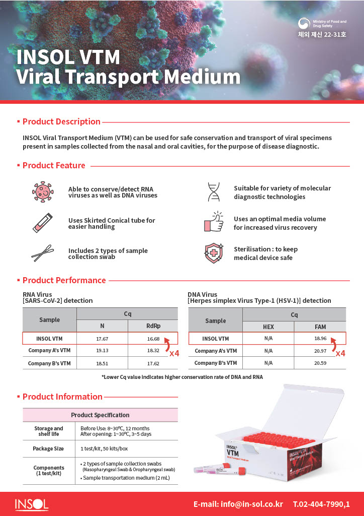 - INSOL VTM Viral Transport Medium (VTM) enables stable preservation and safe transfer of viral specimens collected on nasal or oral swab.