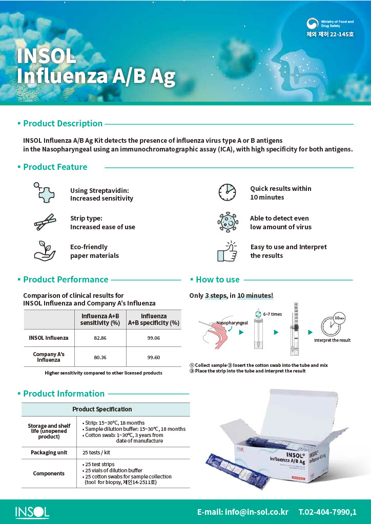 - INSOL Influenza A/B Ag Kit is a highly-sensitive, immunochromatographic assay for the qualitative detection of human influenza A and B viral nucleoprotein antigens in nasopharyngeal specimens.